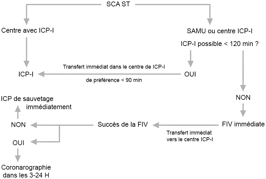 Le délai entre la coronarographie et le premier contact médical sera inférieur à 120 min (centre-ville de Paris), il faut donc l’emmener dans le centre de coronarographie le plus proche. Il n’y a donc pas d’indication à réaliser une fibrinolyse. Il faut débuter une bithérapie antiplaquettaire par aspirine et ticagrelor, et une anticoagulation par HBPM ou héparine non fractionnée (HNF). L’aspirine est le seul antiplaquettaire que l’on donne en IV, le reste est per os via une sonde nasogastrique (SNG) si le patient est inconscient. Attention ! Les doses sont à connaître.