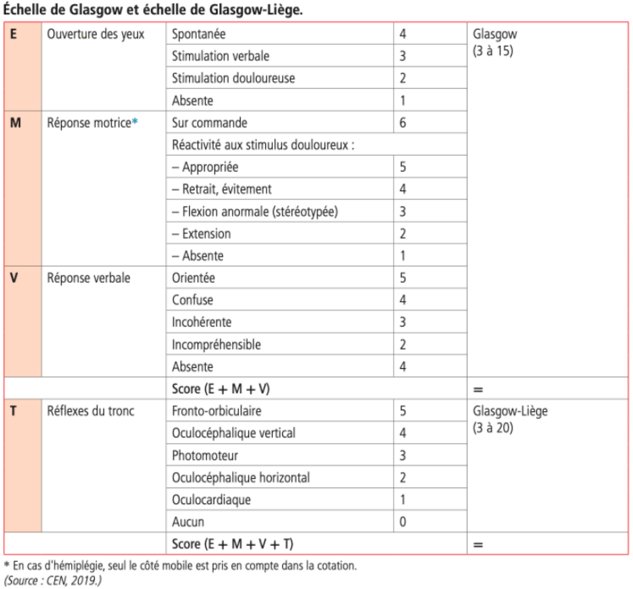 Score de Glasgow = 4 (moteur = 2 ; verbal = 1 ; yeux = 1). Score de Liège = 1 car seule persistance du réflexe oculo-cardiaque. Score de Glasgow-Liège = 5 (sur 20 items). Le score de Glasgow-Liège est à connaître parfaitement (v. figure 6). Figure 6 (source : Collège de neurologie) Source : Collège de neurologie.
