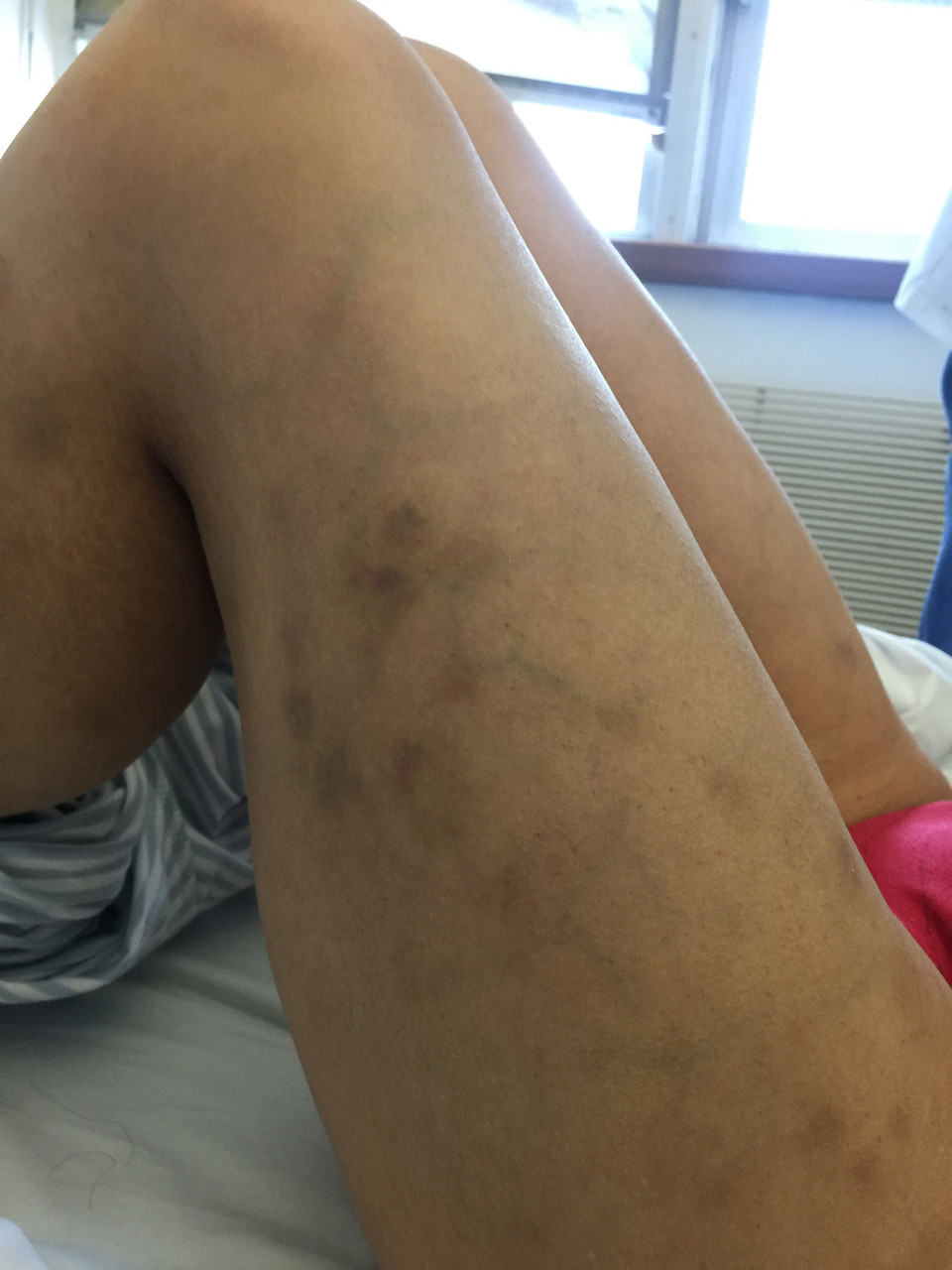 La patiente vous montre sur ses jambes des lésions cutanées violacées/bleutées qu’elle a depuis quelques semaines et dont elle ne vous avait pas parlé auparavant. C’est douloureux à la palpation, quelque peu induré. Figure 4 (source : S. Demortière)