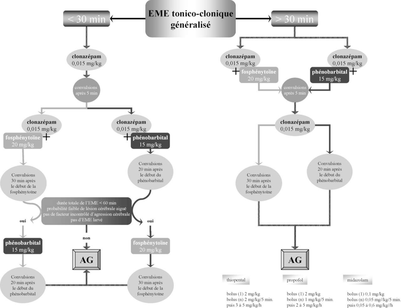 Première étape devant une crise < 30 minutes : clonazépam 0,015 mg/kg. Et protéger les voies aériennes. Figure 6 (source : Outin et al., Prise en charge en situation d’urgence et en réanimation des états de mal épileptiques de l’adulte et de l’enfant (nouveau-né exclu). Recommandations formalisées d’experts sous l’égide de la Société de réanimation de langue française, Réanimation, 2009.)