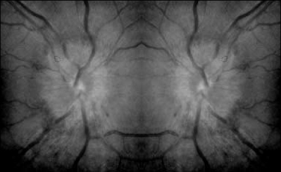Voici une photo de son fond d’œil réalisé aux urgences : Figure 5 (source : L. Laloum, Rev Prat 2001;51:2210-14) Les résultats de l’électroencéphalogramme montrent un ralentissement diffus sans anomalie paroxystique focalisée. La biologie ne retrouve pas d’anomalie de l’ionogramme et une CRP < 0,1 mg/L. Voici des clichés de sa tomodensitométrie (TDM) cérébrale : Figure 6 (source : S. Demortière)