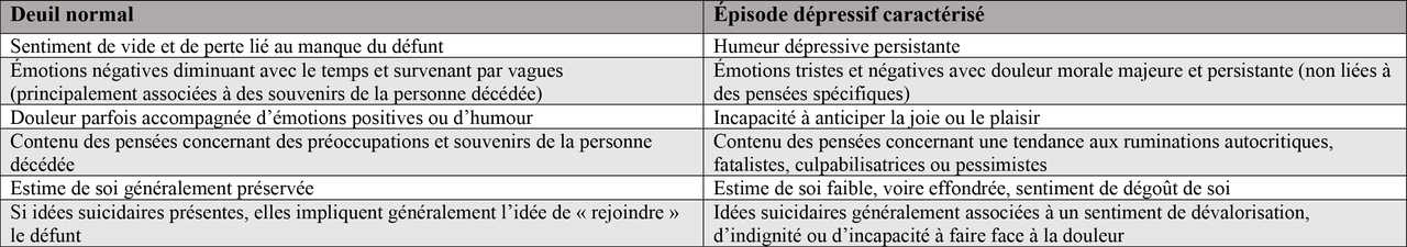 Voici un tableau résumant les critères cliniques qui permettent de distinguer un deuil normal d’un épisode dépressif caractérisé :