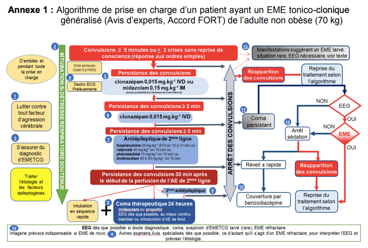Sources : – Collège de neurologie ; – SRLF-SFMU. Prise en charge des états de mal épileptiques en préhospitalier, en structure d’urgence et en réanimation dans les 48 premières heures (à l’exclusion du nouveau-né et du nourrisson).
