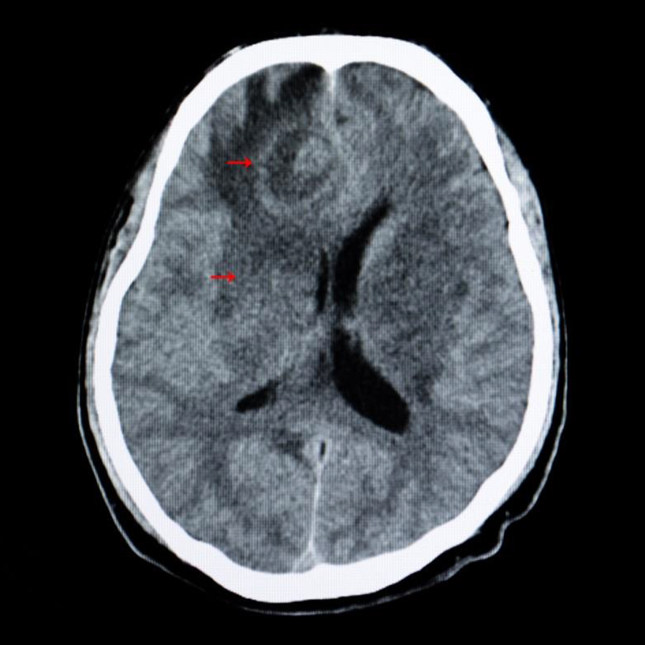 Le patient est transféré en urgence pour une TDM cérébrale afin de réaliser le bilan étiologique de son état de mal épileptique. Voici une coupe de la TDM cérébrale (figure 2). Figure 2 (Source : Adobe Stock)