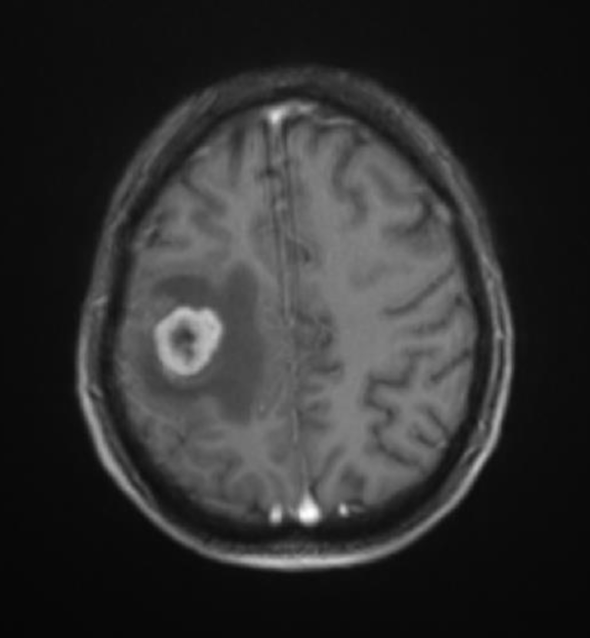 Pour rappel, il s’agit d’une séquence T1 (car anatomique : la substance blanche est plus claire que la substance grise) avec injection de gadolinium (prise de contraste des sillons et des artères méningées). C’est une image typique de métastase cérébrale avec une image arrondie, sous-corticale, avec œdème périlésionnel (hyposignal T1), avec l’image en cocarde (prise de contraste périphérique).