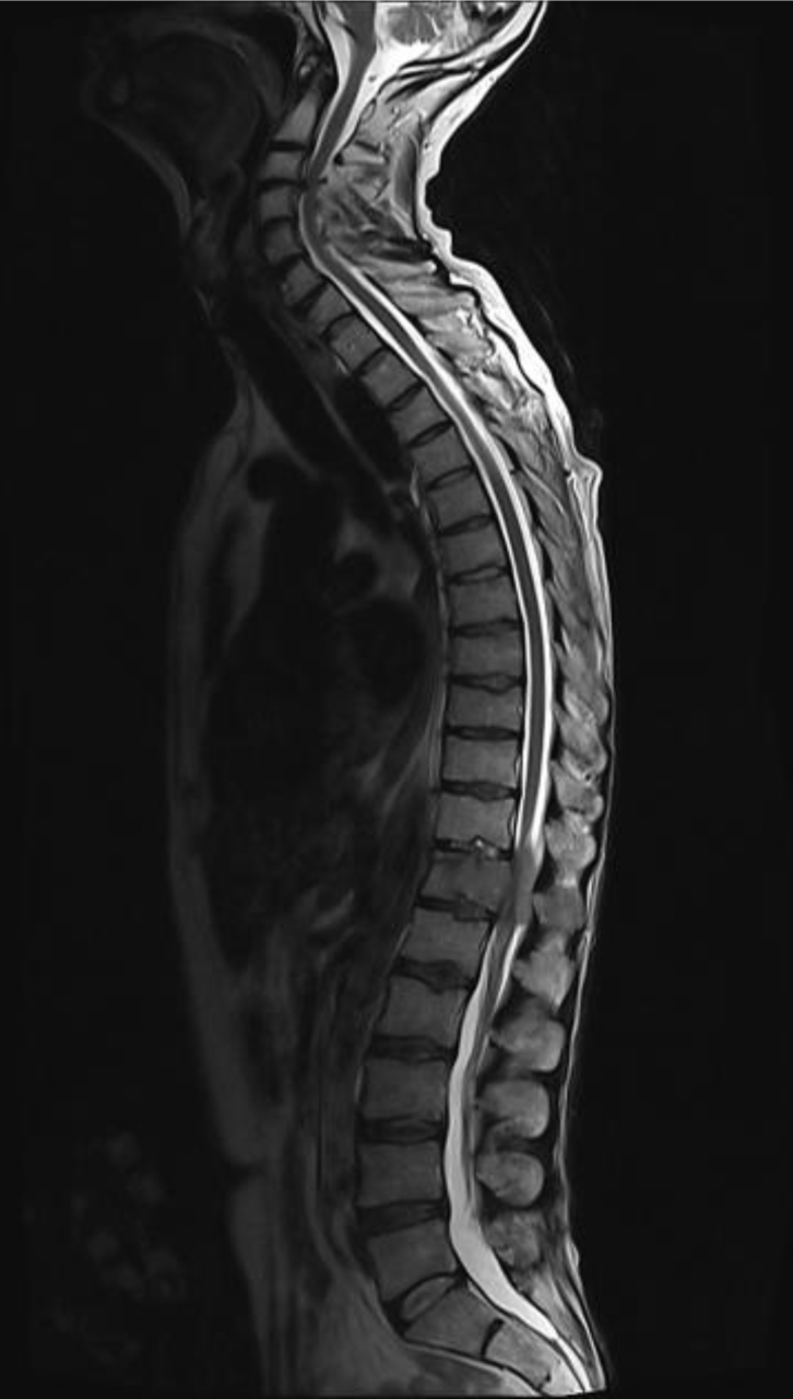L’examen clinique neurologique ne montre pas de déficit sensitivomoteur aux 4 membres, hormis une hypoesthésie à hauteur de T12. Les réflexes ostéotendineux (ROT) sont vifs, mais non diffus ni polycinétiques. Il existe une douleur à la palpation des épineuses de la région lombaire haute. Vous palpez également une adénopathie sus-claviculaire gauche. Le reste de l’examen clinique est sans particularité.