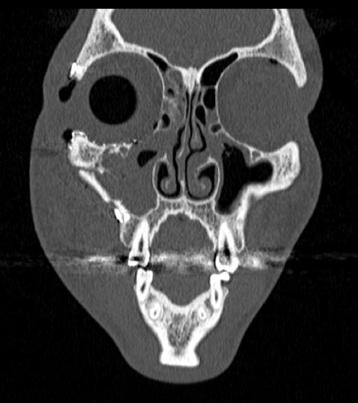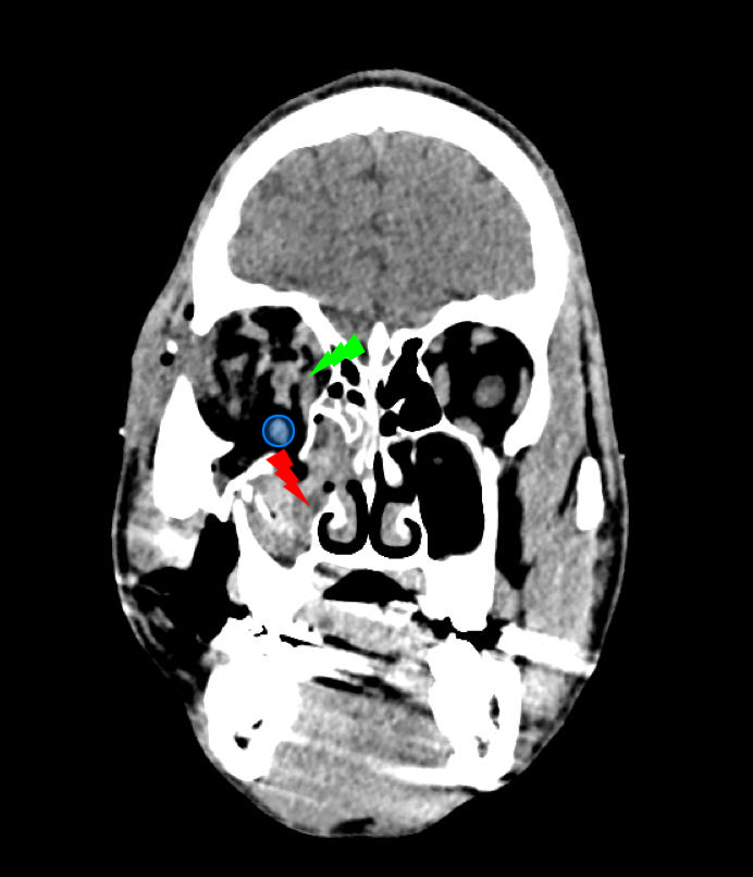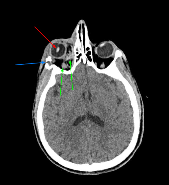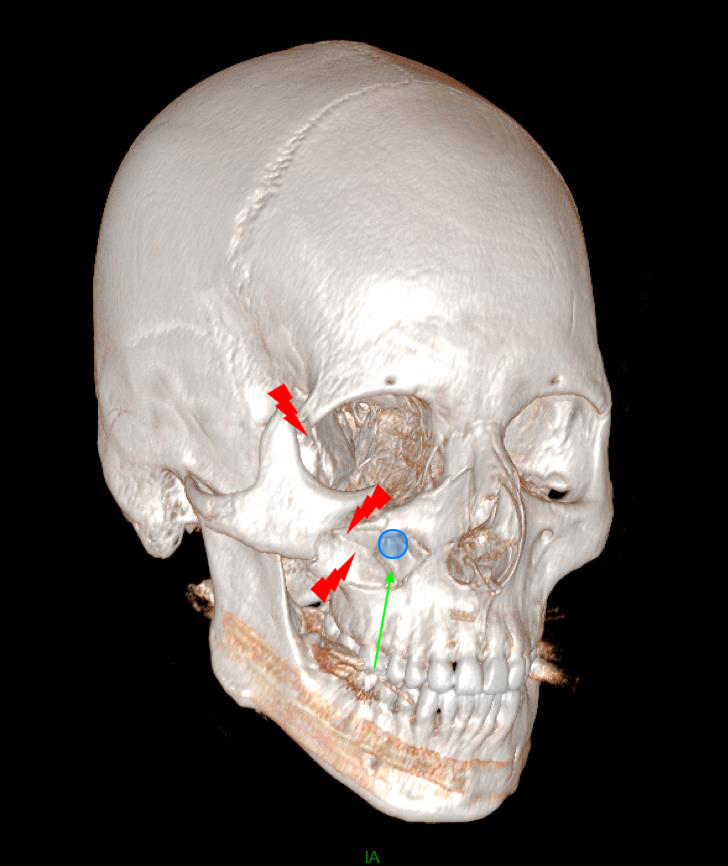 De garde, vous êtes appelé en salle de surveillance post-interventionnelle (SSPI) dans votre hôpital où vient d'être admis un patient conduit sur place par le service d'aide médicale d'urgence (Samu). Il s’agit d’un jeune homme de 20 ans, Monsieur D. Il aurait été victime, entre autres, d’un tir de Flash-Ball lors d’une rixe. Le projectile l’a atteint au niveau de la pommette et de l’orbite droites. Il présente une plaie de la région jugale haute, un œdème des paupières supérieure et inférieure. Vous ne visualisez pas le globe oculaire spontanément. Il est hémodynamiquement stable.