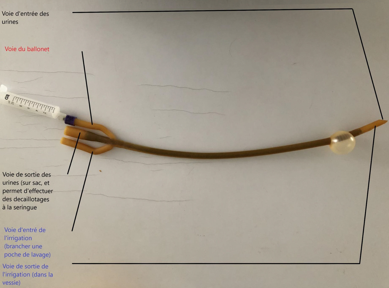 De plus, la présence d’un caillotage vésical expose à un risque de récidive des épisodes de rétention. Pour cette raison, il est nécessaire de mettre en place une sonde trois voies (ou double courant) pour effectuer un décaillotage à la seringue et des lavages endovésicaux continus.