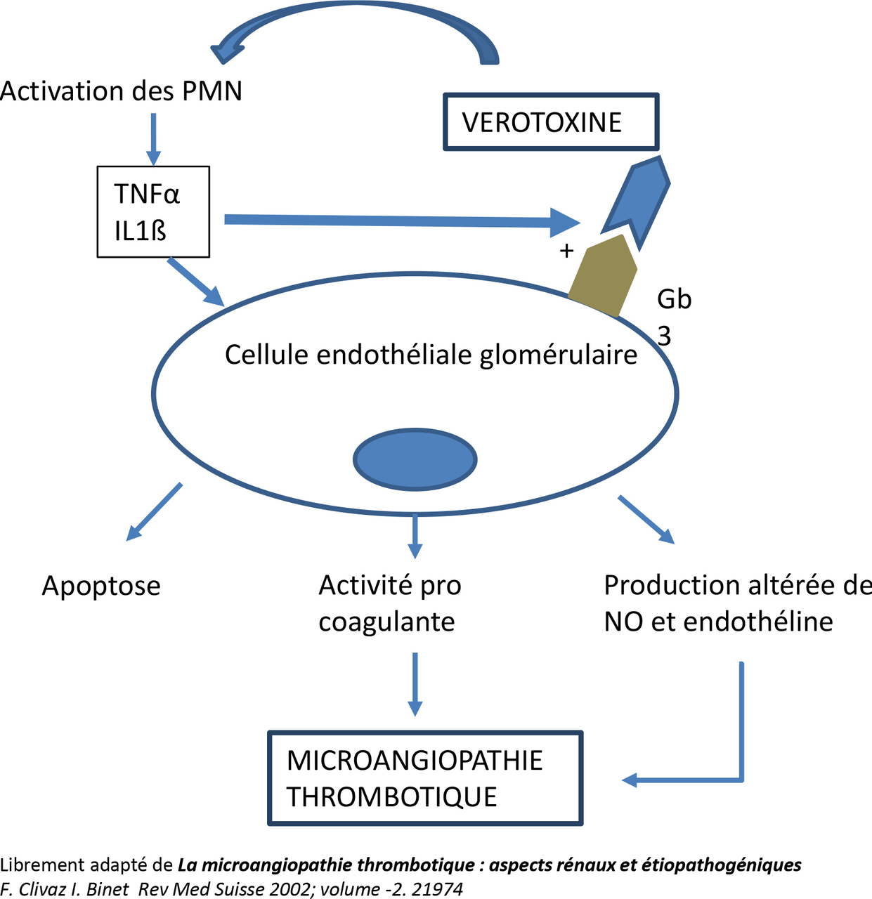 En pratique, chez l’adulte, le SHU post-diarrhéique typique est plus rare et une ponction biopsie rénale (PBR) sera réalisée après contrôle de l’HTA et de la thrombopénie. La lésion initiale est endothéliale, à l’origine d’une agrégation plaquettaire et de la formation de thrombi fibrino-plaquettaires. Figure 2. Mécanisme d'action de la vérotoxine sur la cellule endothéliale glomérulaire. Cyrielle Parmentier, La Revue du Praticien