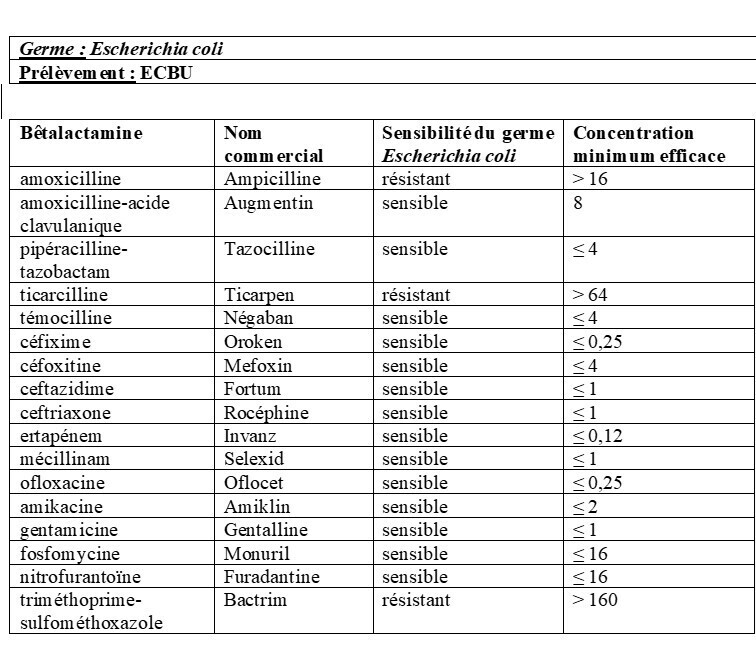Une sonde double J a été posée au bloc dans les cavités pyélocalicielles gauches de Mme X. Elle est sous céfotaxime et amikacine, et devient apyrétique 24 heures après l’intervention. Vous obtenez à J2 de l’intervention les résultats de l’ECBU prélevé aux urgences ainsi que l’antibiogramme associé (tableau). Tableau (Théo Arber, La Revue du Praticien)À noter : la ceftriaxone et la céfotaxime ont le même spectre et le même type d’action.