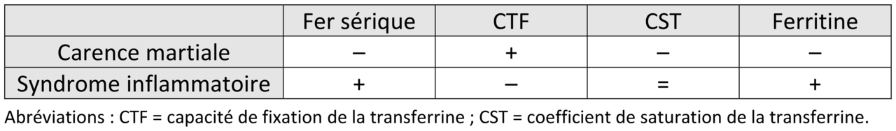 En cas d’inflammation, il est nécessaire d’effectuer un bilan martial complet (figure 1) afin de faire la part des choses entre anémie inflammatoire et anémie par carence martiale.