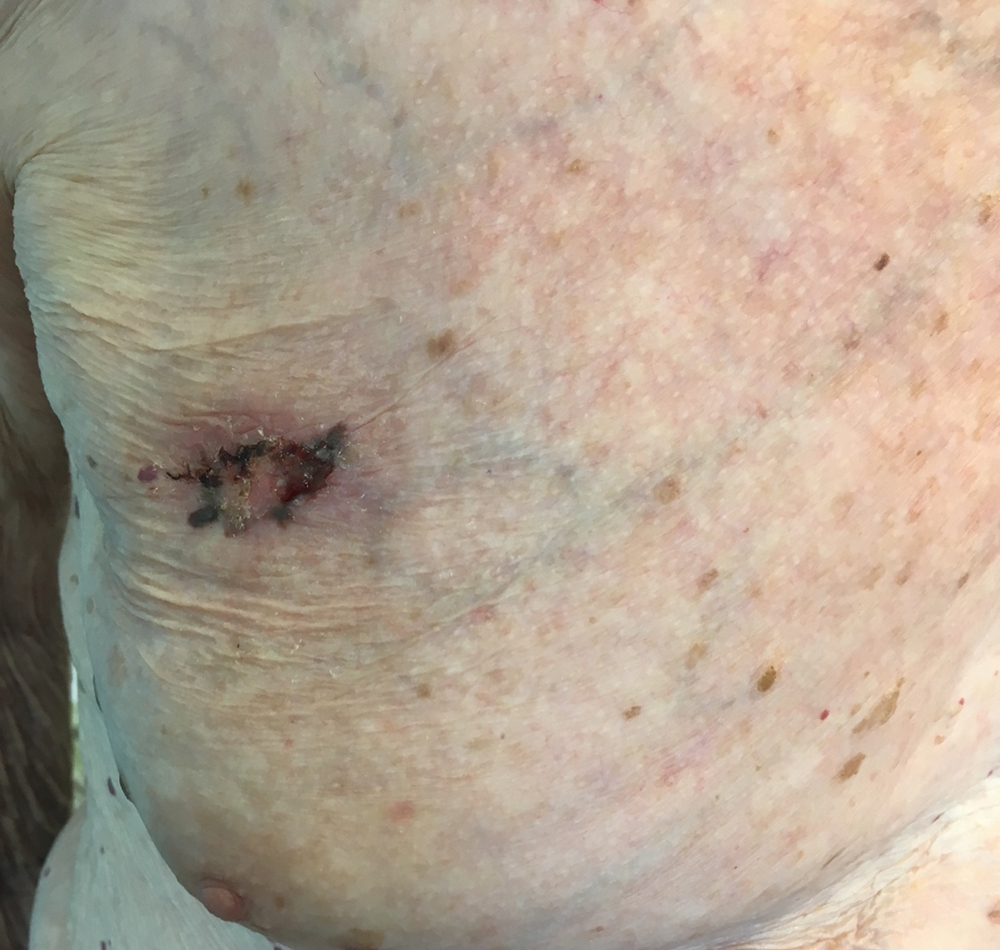 M. H., 82 ans, maître-nageur retraité, vous consulte car il a remarqué depuis huit mois l’apparition d’une lésion un peu au-dessus de son sein droit. Elle évolue progressivement du noir vers le blanc par endroits. Il ne rapporte aucun traumatisme en regard.