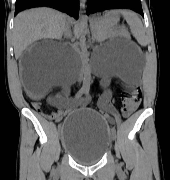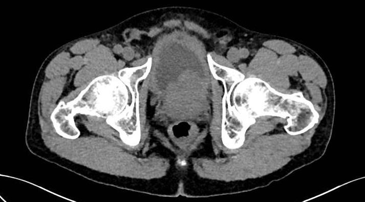 Le scanner montre une uretéro-hydronéphrose bilatérale avec globe vésical et dilatation importante des cavités pyélocalicielles. Sur la coupe axiale, on voit une hypertrophie de la prostate (surtout le lobe médian) compatible avec une hypertrophie bénigne de la prostate. Le diagnostic de cancer ne peut être éliminé mais les données du toucher rectal ne sont pas en faveur.