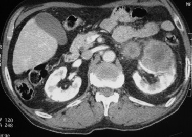 L’examen présenté est un TDM abdomino-pelvien en coupe transversale avec injection de produit de contraste au temps veineux. On retrouve sur la coupe présentée : une volumineuse masse tissulaire rénale gauche. On ne retrouve pas sur la coupe présentée : de thrombus veineux (veine rénale ou veine cave inférieure) ; d’adénopathies ; de seconde tumeur rénale gauche ou droite ; de nodule hépatique ou pulmonaire. Au total, sur la coupe présentée, on conclut à un cancer localisé du rein gauche.