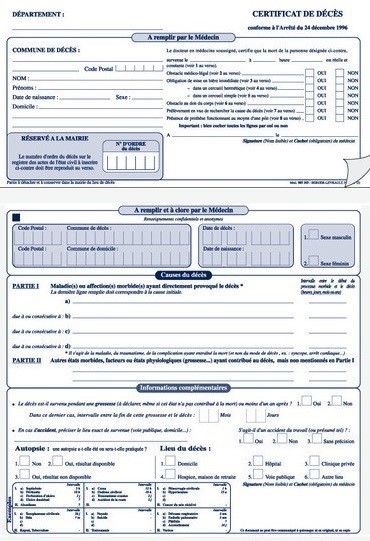 Rappel sur le certificat de décès : Partie supérieure : nominative et non confidentielle, à visée administrative : informations diverses : commune de décès, état civil du défunt, date et heure de la mort, signature du médecin et son cachet ; caractère réel et constant de la mort ; Différentes rubriques permettant à l'officier d'état civil d'autoriser ou de refuser certaines opérations funéraires = principal objectif obstacle médico-légal (crime, délit, suicide, accident du travail et maladie professionnelle, accident de la voie publique, mineur, détenu) ; présence de prothèse fonctionnant au moyen d'une pile ; obligation de mise en bière immédiate ; cercueil simple ou hermétique ; obstacle au don du corps ; prélèvement en vue de rechercher la cause du décès. La partie supérieure est en triple exemplaire et est destinée à la mairie de la chambre funéraire, à la chambre funéraire, à la mairie du lieu de décès Partie inférieure : anonyme et confidentielle, à visée épidémiologique. Cette partie sera détachée de la partie supérieure par l'officier d'état-civil qui l'adressera au médecin de l’ARS afin d'effectuer des statistiques. Rubriques : commune du décès, du domicile, date de décès, date de naissance, sexe, cause du décès, lieu du décès.