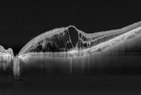 Le décollement séreux rétinien correspond à du fluide hyperréflectif entre la rétine neurosensorielle et l’épithélium pigmentaire
