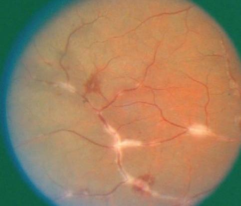 L’examen de la périphérie temporale du fond d’œil de l’œil droit est présenté ci-dessous. L’examen de l’œil gauche est similaire.