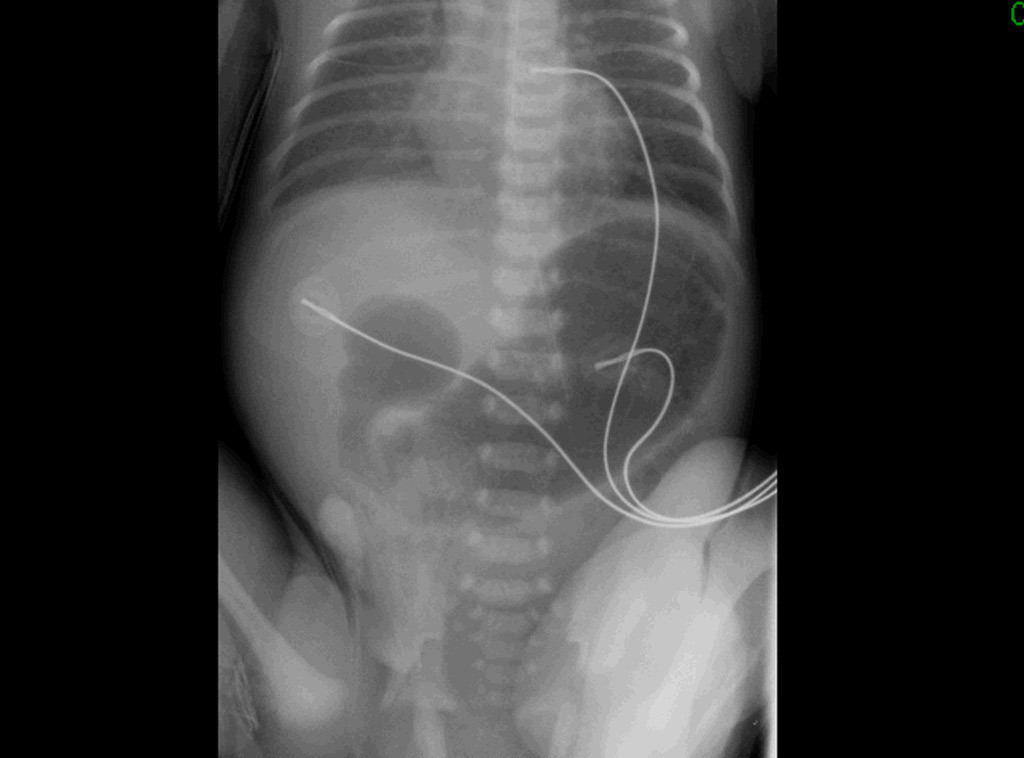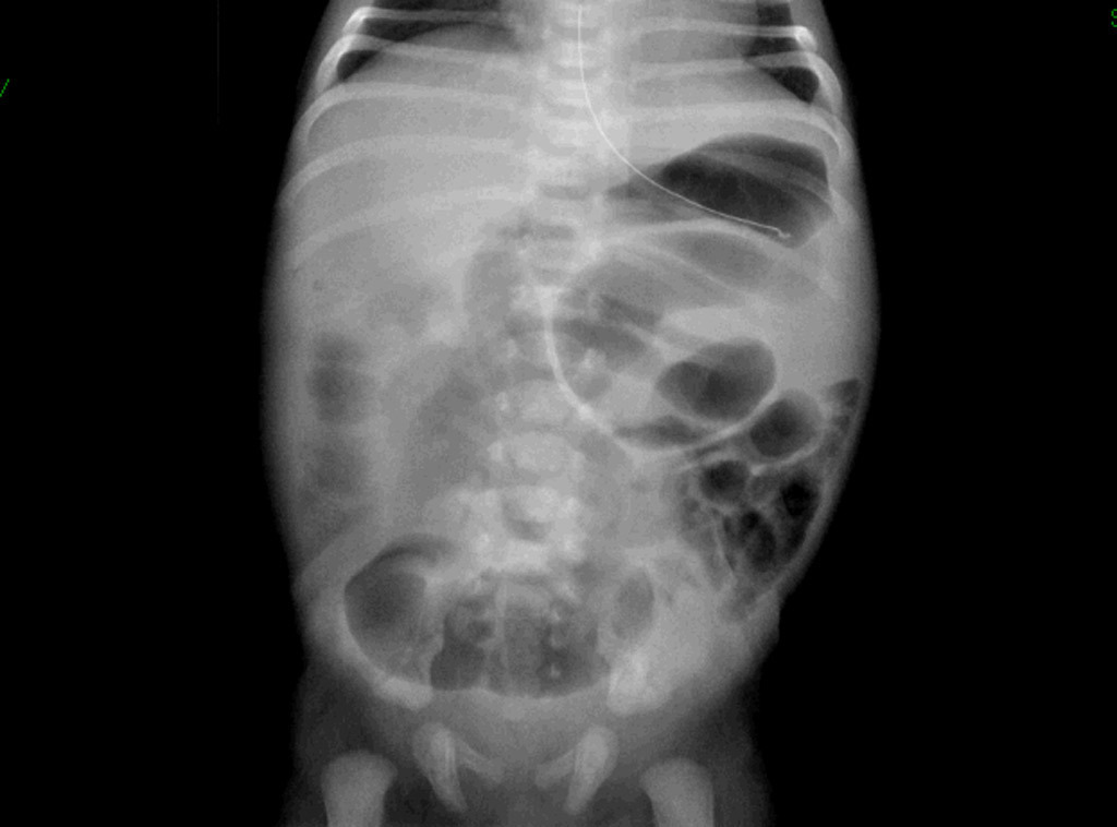 Vous recevez à 20 heures aux urgences pédiatriques Martin, âgé de 10 jours, pour des vomissements évoluant depuis deux heures. Martin est né au terme d’une grossesse bien suivie menée sans particularité. À la naissance, il pesait 3 100 g, mesurait 50 cm et son périmètre crânien (PC) était de 35 cm. L’accouchement a eu lieu par voie basse après 14 heures de rupture de la poche des eaux. Martin est nourri avec du lait artificiel depuis la naissance. Le premier méconium a été émis à 24 heures de vie. À la sortie de la maternité, il pesait 3 120 grammes. Les vomissements, de couleur verte, sont survenus une heure après la prise du dernier biberon. Les dernières selles ont été émises à 3 heures ce jour.