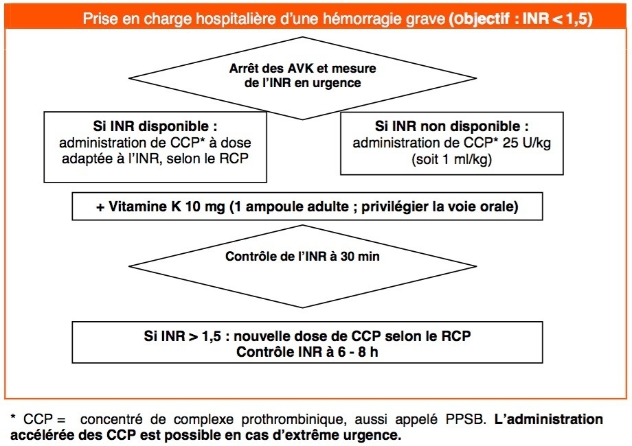 contrôle de l’INR à 6-8 heures. En cas d’hémorragie sous anticoagulants oraux directs (antithrombine, anti-Xa) : administration en urgence de PPSB ou Feiba.