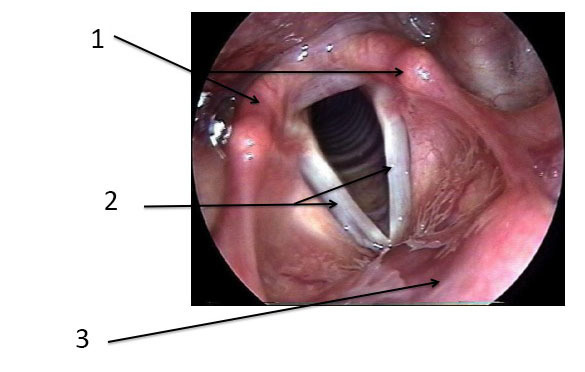 C’est la face postérieure de l’épiglotte. On peut la repérer car elle est juste en avant de la commissure antérieure des cordes vocales