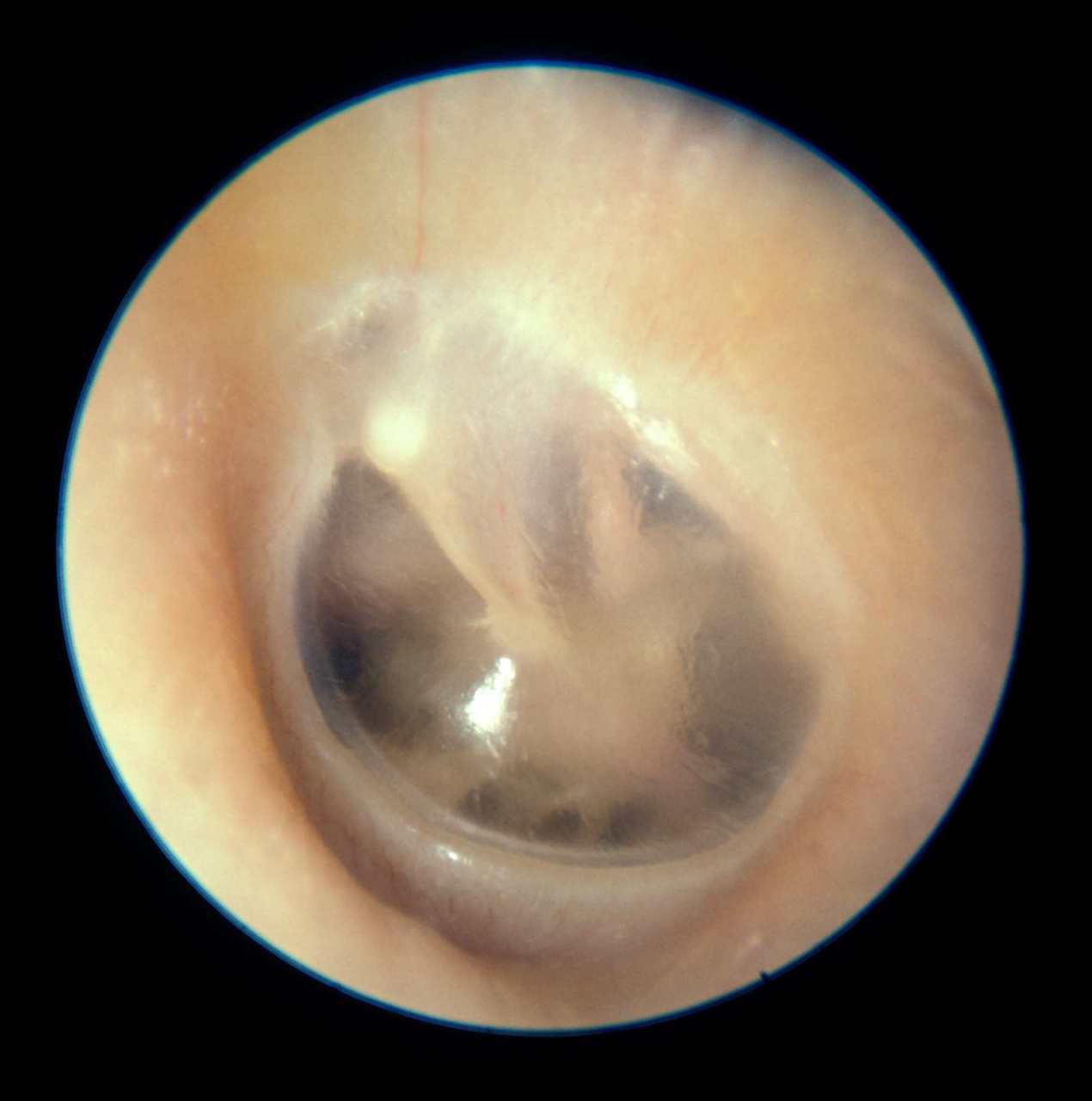 Le tympan est légèrement transparent. Il n’est pas épaissi/grisâtre (fine lame liquidienne) et on ne voit pas de niveau hydro-aérique ou de bulle