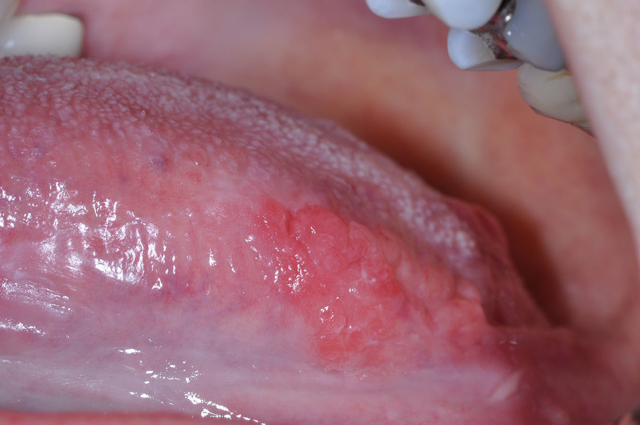 Vous examinez la cavité buccale et constatez ceci à gauche sur le bord libre de la langue. À la palpation, vous constatez une masse dure