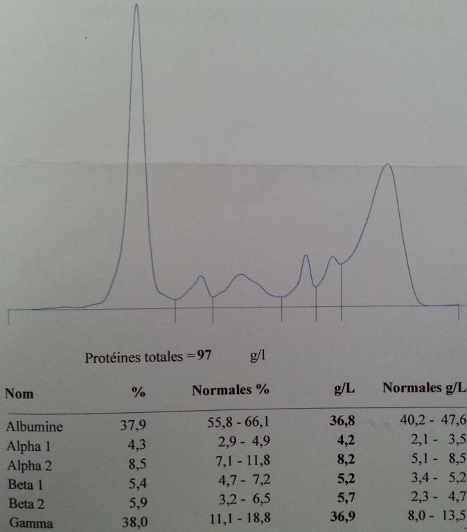 Leucocytes : 12 000/mm3 dont polynucléaires neutrophiles : 9000/mm3, polynucléaires éosinophiles : 900/mm3, polynucléaires basophiles : 0/mm3, lymphocytes : 1600/mm3, monocytes : 500/mm3, hémoglobine : 10,2 g/dl, VGM : 85fl, plaquettes : 570 000/mm3.