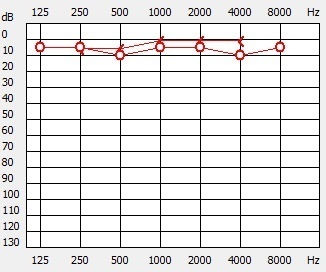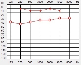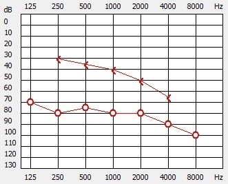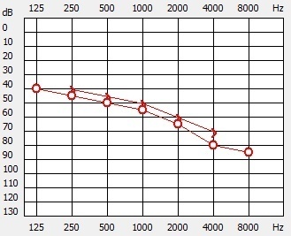 Il y a ici une surdité de perception classique avec une baisse sur les aigus, mais il n’y a pas de surdité de transmission correspondant à l’hémotympan. Cette courbe peut correspondre à une presbyacousie