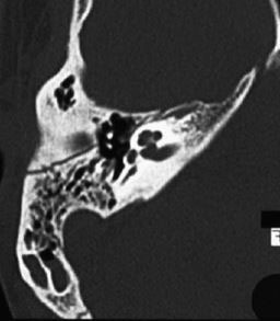 L’oreille moyenne correspond à la partie externe du rocher. C’est la cavité où se trouvent les osselets qui est normalement remplie d’air. Elle doit donc être noire sur le scanner (elle est ici partiellement remplie de liquide en gris)