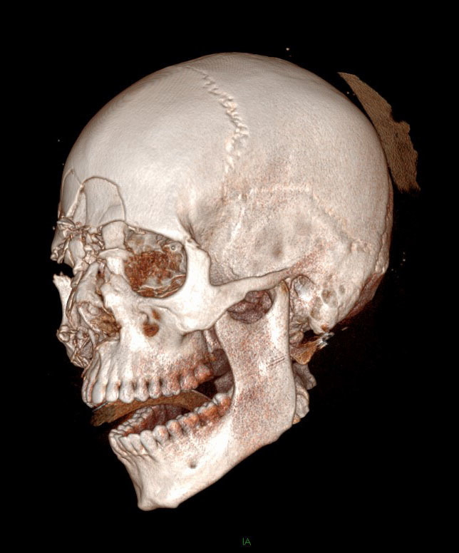 Question 4 - Il n’y a pas d’urgences neurochirurgicales sur le scanner (pas d’hématome intracrânien ni de brèche ostéoméningée). Voici les clichés de reconstruction 3D. Figure 2Figure 3Figure 4