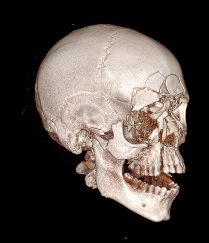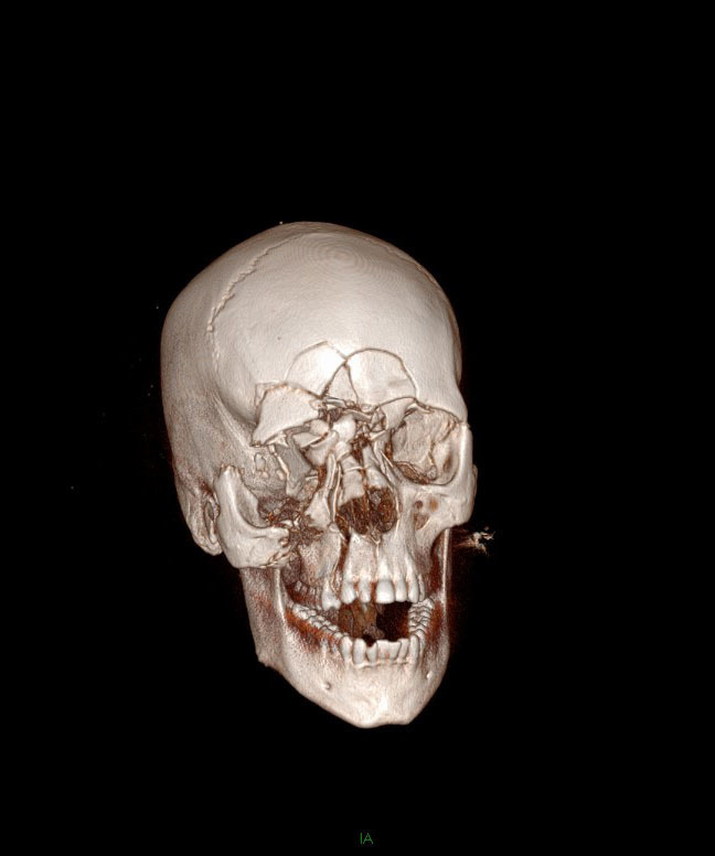 À l’examen clinique, on retrouve un œdème facial important (faciès lunaire) prédominant à droite, ainsi qu’un hématome en lunettes. L’articulé dentaire est conservé à gauche mais pas à droite. Le patient présente un trismus et un effacement de la pommette à droite. Par ailleurs, le relief de la pyramide nasale est effacé, il y a un télécanthus et une énophtalmie droite. Il n’y a pas de mobilité du palais ou de l’arcade dentaire.