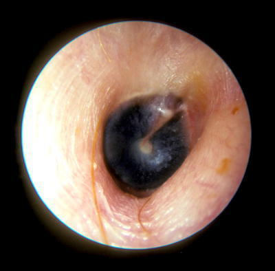 Hémotympan : visualisation d’un hématome dans l’oreille moyenne. C’est l’image typique dans le contexte de fracture du rocher