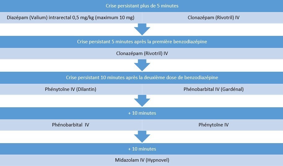En cas de persistance des crises au-delà de 5 minutes, un traitement épileptique doit être administré immédiatement