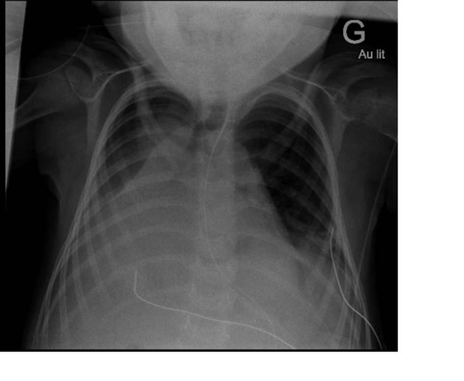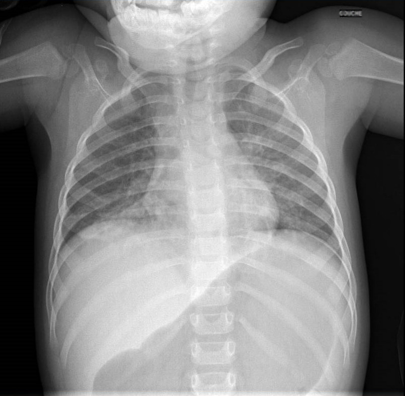 À l’examen clinique 24 heures plus tard, vous notez : fréquence cardiaque = 135/mn ; température = 39 °C ; fréquence respiratoire = 70/mn ; SpO2 en air ambiant = 89 % ; absence de marbrures ; tirage sous-costal et balancement thoraco-abdominal ; tonus inchangé ; pas d’éruption cutanée ; pas d’hépatomégalie.