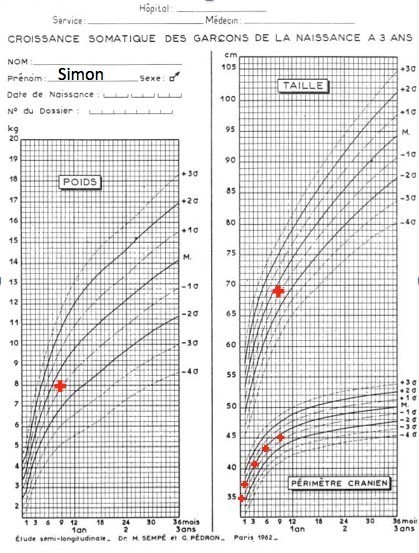 Simon est né à 39 semaines d’aménorrhée, au terme d’une grossesse de déroulement normal. Vous ne notez pas d’antécédent particulier en dehors d’une bronchiolite à l’âge de 3 mois et d’une otite moyenne aiguë purulente à 4 mois. Les vaccinations sont à jour. Simon est alimenté avec du lait premier âge depuis la naissance, la diversification a été débutée à l’âge de 4 mois. Il est gardé en crèche.