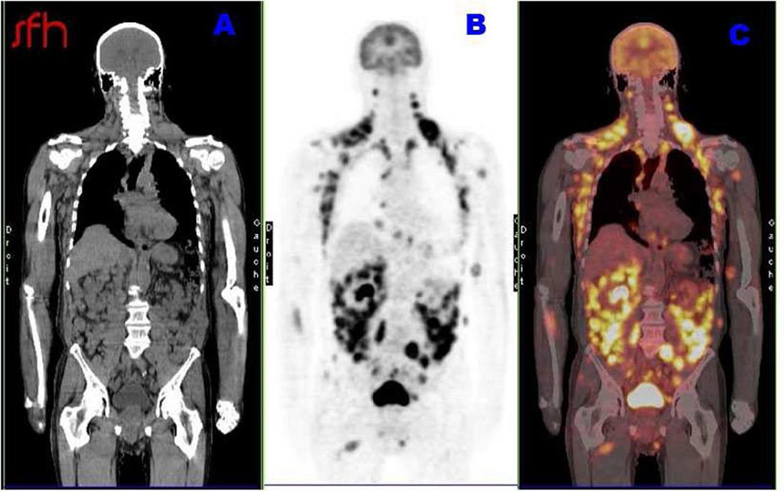 Maxime, 21 ans, étudiant en droit, se présente à votre consultation pour une asthénie trainante et s’intensifiant depuis un mois, responsable d’un absentéisme professionnel. Il a maigri de 5 kg ces trois derniers mois (poids actuel 72 kg pour un poids de forme à 77 kg) et souhaiterait que vous lui prescriviez des vitamines. Il se plaint de démangeaisons sur tout le corps, d’une toux sèche et de lombalgie mal calmée par 4 g de paracétamol. À l’anamnèse, ce dernier vous rapporte une fébricule vespérale à 38,5 °C au coucher disparaissant le matin au réveil. Par ailleurs, il rapporte des sueurs nocturnes particulièrement gênantes. Pas de voyage récent. À l’examen clinique, vous retrouvez des lésions de grattage dans le dos, une adénopathie sus claviculaire droite de 2,5 cm, une adénopathie inguinale droite de 3 cm et une splénomégalie à trois travers de doigt. Son bilan biologique est le suivant : natrémie : 140 mmol/L, kaliémie : 3,9 mmol/L, créatinémie : 73 µmol/L, Hb : 10,3 g/dL, VGM : 85 µm3, globules blancs : 8 G/L avec des polynucléaires neutrophiles à 2,5 G/L, des polynucléaires éosinophiles à 1,7 G/L et des lymphocytes à 2 G/L, plaquettes : 156 G/L, pas de cellules anormales circulantes. La VS est à 82 mm à 1 heure et la CRP 153 mg/L. Au regard de l’anamnèse et de l’examen clinique, vous décidez d’hospitaliser le patient pour élargir les explorations.