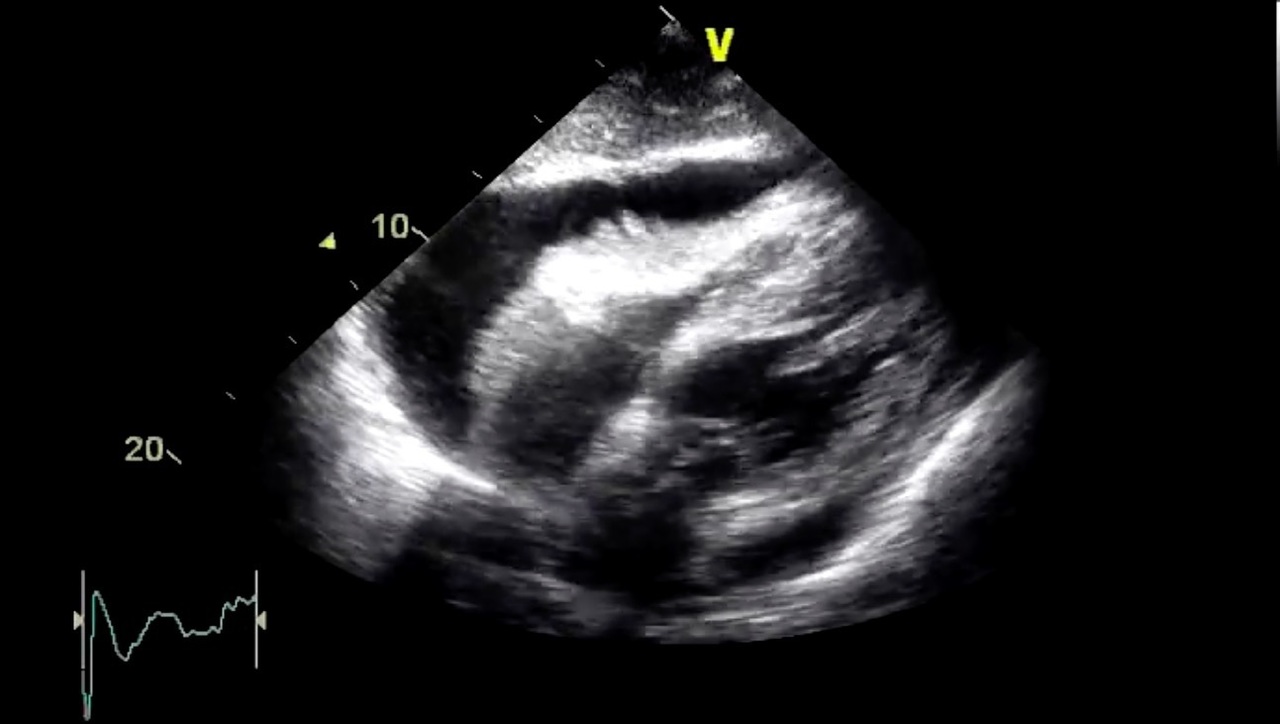 Voici la coupe sous-costale de l’échographie cardiaque que vous réalisez en urgence (figure 5). La valve mitrale est normo-fonctionnelle. Le ventricule droit est modérément dilaté. Les pressions artérielles pulmonaires systoliques sont normales, estimées à 30 mmHg. La pression de l’oreillette droite est augmentée, estimée à 20 mmHg, avec une veine cave inférieure dilatée et non compliante. Vous observez une variation des flux mitraux et aortiques avec la respiration. Le débit cardiaque est abaissé.