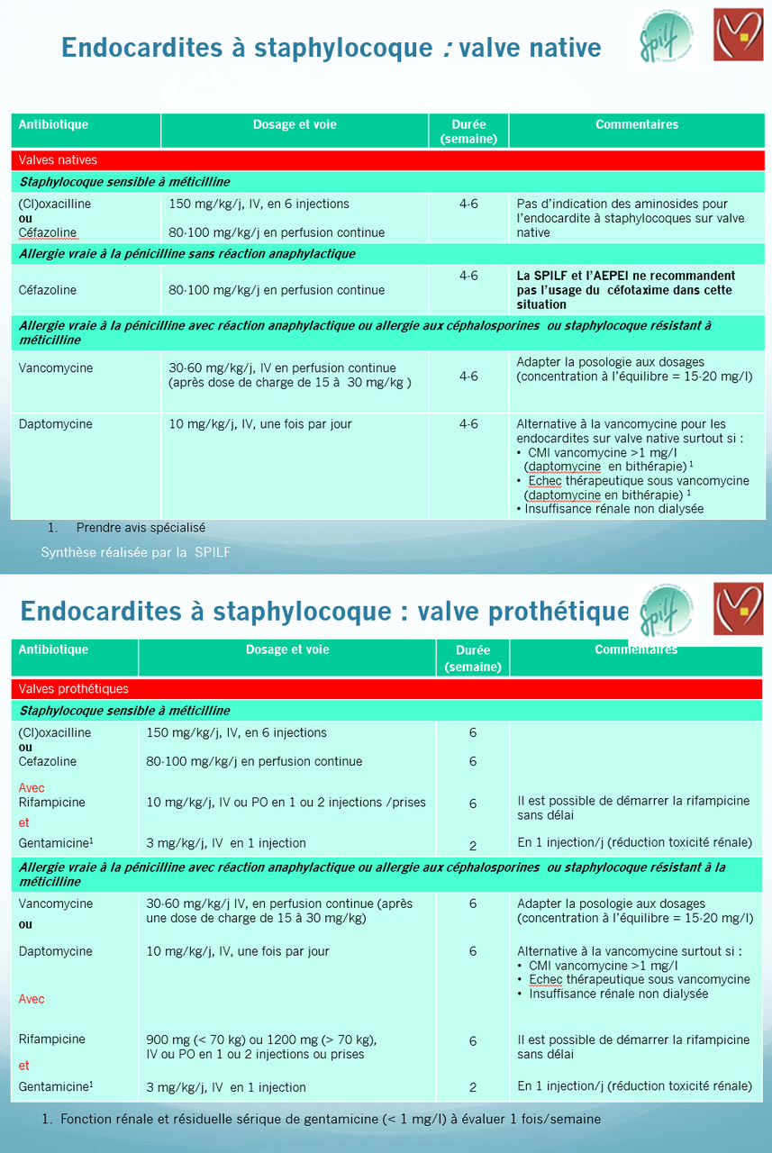 Voici les recommandations de l’ESC 2015 pour l’antibiothérapie probabiliste sur valve prothétique :