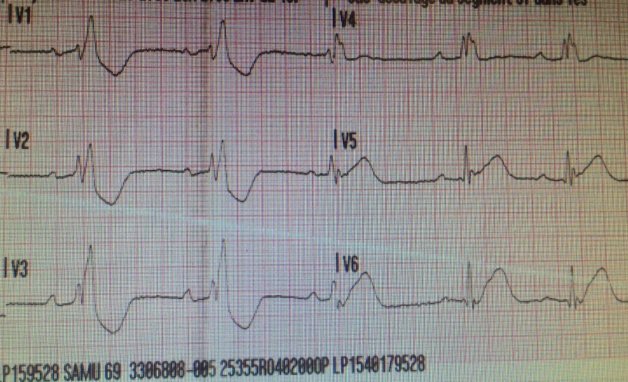 L’électrocardiogramme s’inscrit en rythme sinusal régulier avec des ondes Q dans le territoire inférieur. Le sus-décalage du segment ST a régressé.
