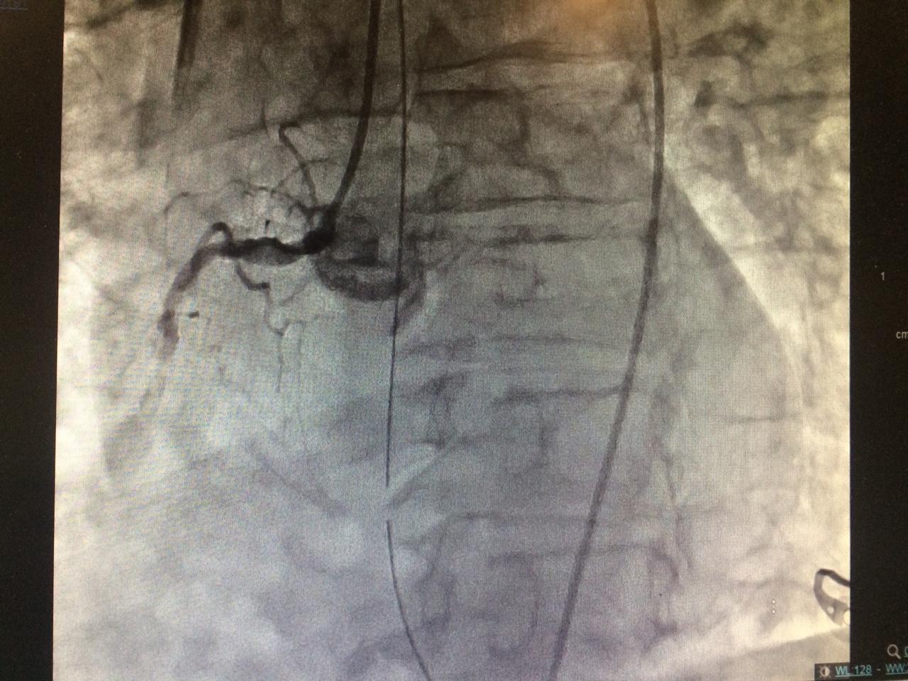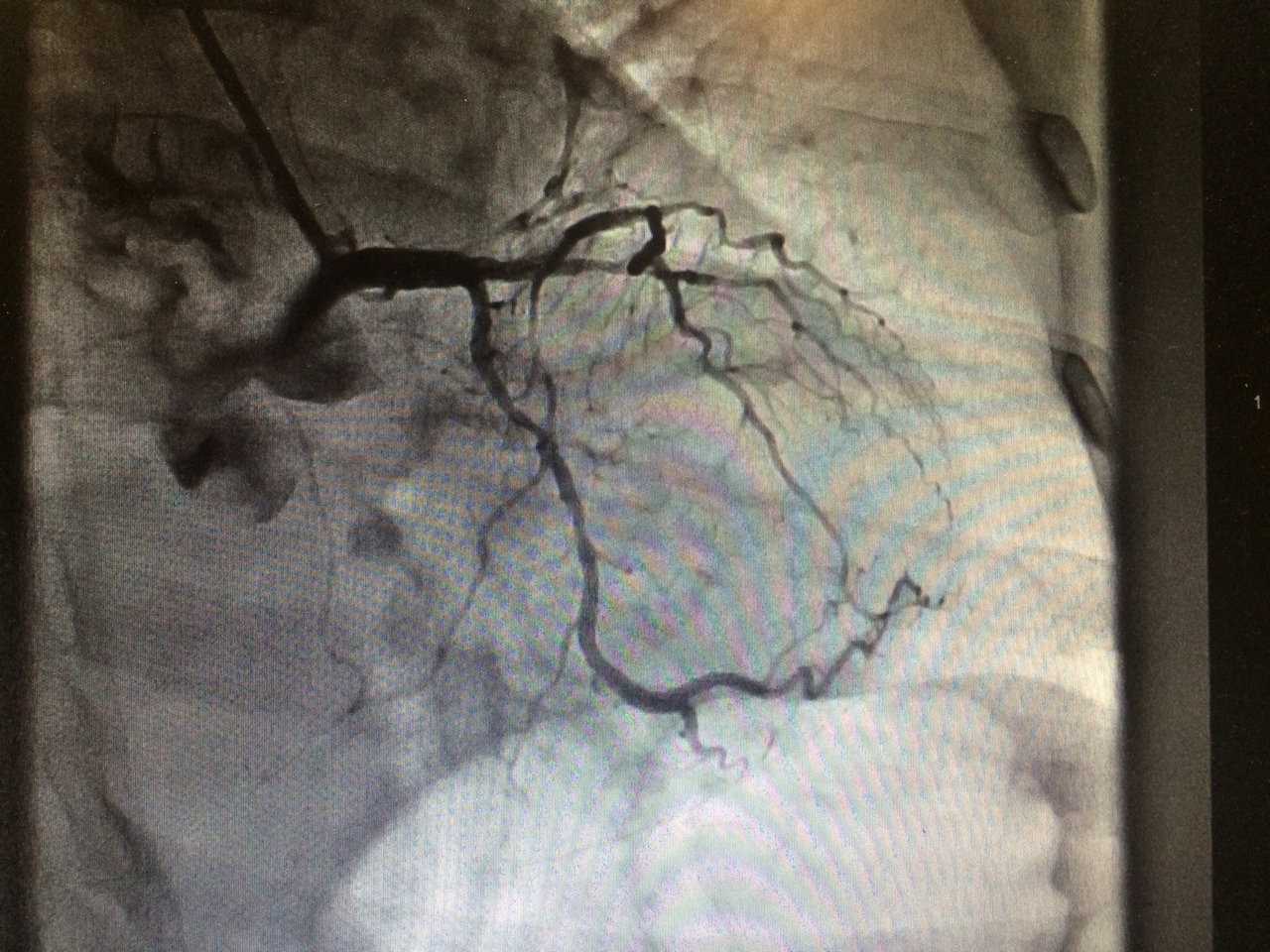 Vous retenez donc le diagnostic d’infarctus inférieur Killip 1, de prise en charge tardive sur occlusion de la coronaire droite. Le patient est thrombo-aspiré et bénéficie de l’implantation d’un stent actif sur la coronaire droite moyenne. Le résultat angiographique est optimal avec rétablissement d’un flux TIMI 3. L’artère interventriculaire antérieur et circonflexe sont athéromateuses, sans lésion significative par ailleurs.