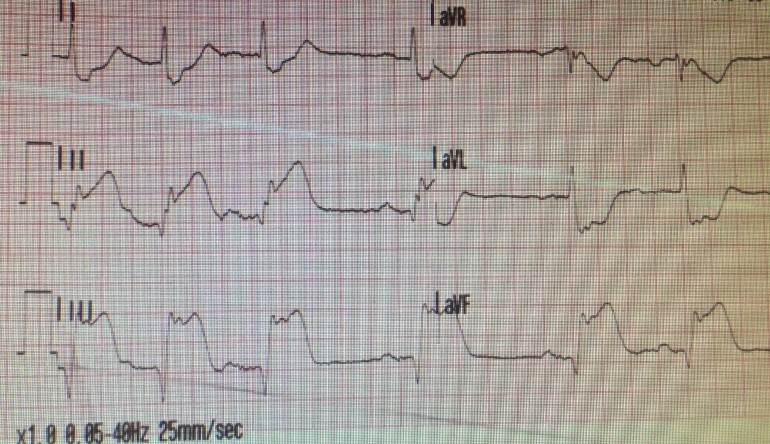 Électrocardiogramme typique. Diagnostic de coup d’œil, impossible à manquer ici :