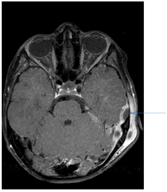 L’abcès est bien ici sous-périosté à l’extérieur et au contact de l’os. Un abcès intra-parenchymateux serait en cocarde et dans la substance blanche cérébrale.