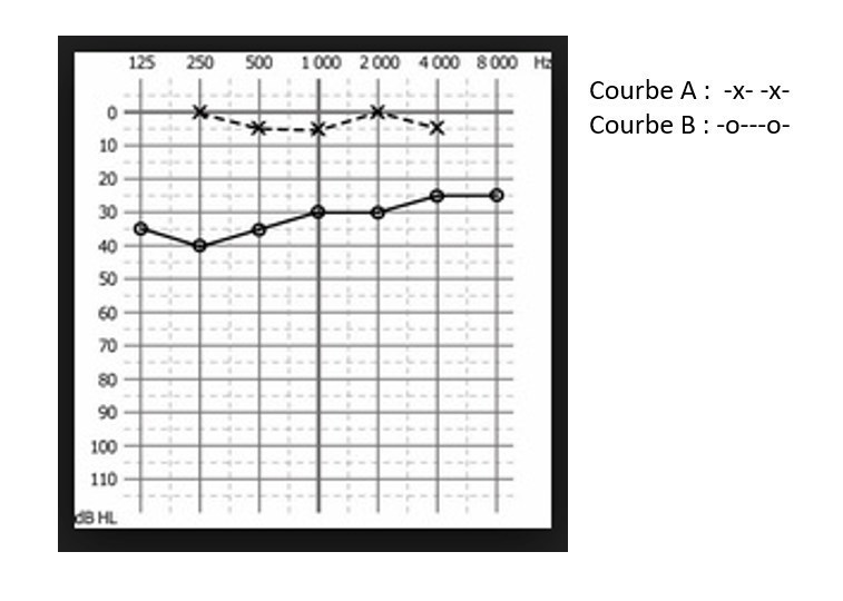 On a ici la courbe du haut en pointillé qui représente la courbe osseuse, celle qui reflète l’audition « centrale », les voies auditives allant de la cochlée au cortex. Si elle est normale, la perte est donc transitionnelle et on a un alors un Rinne audiométrique (c’est-à-dire une différence entre la courbe osseuse perçue et l’aérienne).
