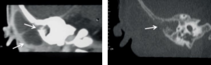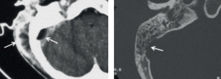On voit ici sur la flèche de droite la thrombose du sinus latéral.