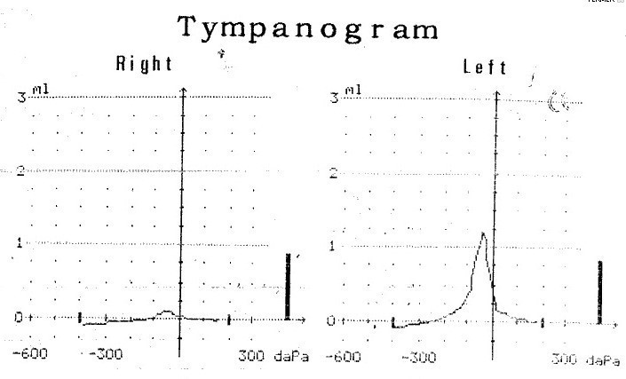 On aura dans le contexte une otite séro-muqueuse droite. Il y a donc un comblement liquidien rétro-tympanique qui va atténuer la transmission des ondes acoustiques (l’air est mieux transmis dans l’air que dans l’eau).