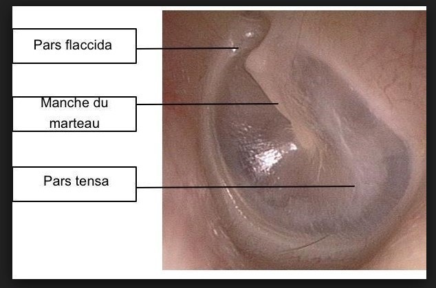 Pour repérer le côté de l’otoscopie il faut garder en tête que le manche du marteau et son col forment un angle ou une flèche qui pointe vers l’avant du patient. Ici on est donc bien à gauche.