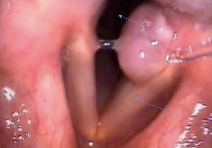 Vous pratiquez cet examen pour étayer votre hypothèse diagnostique. Vous mettez en effet en évidence un granulome sur une corde vocale constituant une laryngite de contact prolongé à la sonde d’intubation