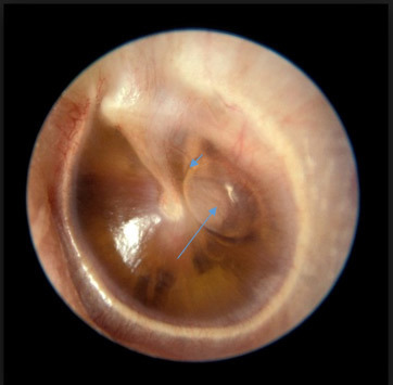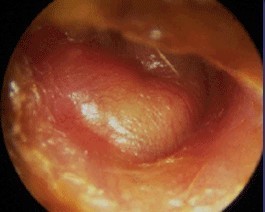 Le tympan ici est couleur chamois. Ceci est spécifique d’une rétention séreuse rétro-tympanique. On voit de plus une bulle liquidienne dans le quadrant postéro-inférieur.