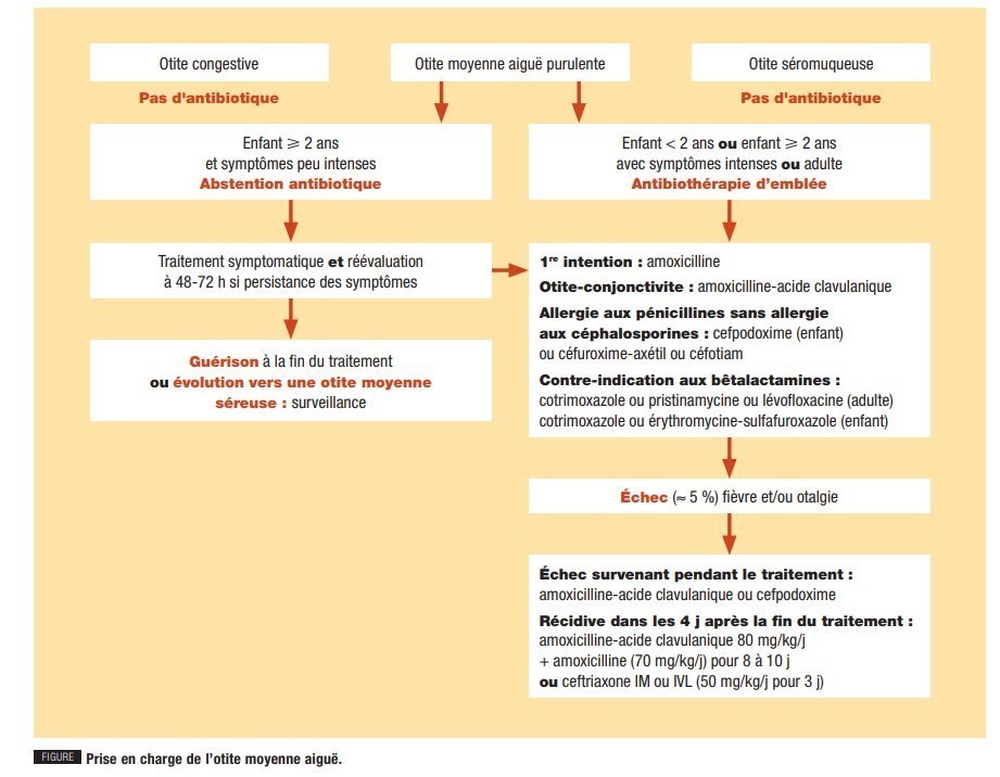 Recommandations infectiologie Pilly 2018 . Antibiothérapie probabiliste de 1re intention des OMA purulentes : amoxicilline per os ; si association syndrome otite + conjonctivite, amoxicilline-acide clavulanique per os à la place. . Antibiothérapie de 2e intention : – allergie vraie aux pénicillines sans contre-indication aux céphalosporines : cefpodoxime (enfant) ; cefpodoxime ou céfuroxime-axétil (adulte) ; – en cas de contre-indication aux bêtalactamines : enfant ; cotrimoxazole ou pristinamycine (si plus de 6 ans) ; adulte : pristinamycine ou cotrimoxazole ou lévofloxacine (en dernière intention). Adultes et enfant > 2 ans : 5 jours de traitement. Enfant < 2 ans : traitement d’emblée et de 8 jours.