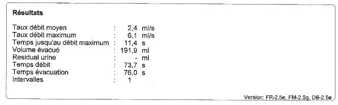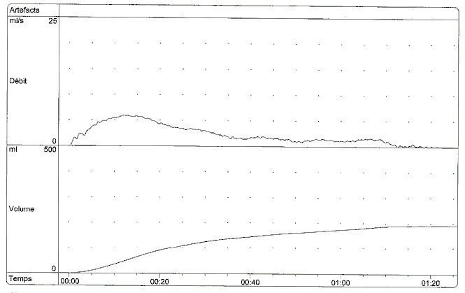Il s’agit évidemment d’une débitmétrie, examen simple et peu coûteux, essentiel dans l’évaluation initiale et le suivi de l’hypertrophie de prostate. Une courbe normale est une courbe en cloche, unique, avec un Qmax > 15 mL/s. Attention ! pour que l’interprétation d’une débitmétrie soit possible, le volume uriné doit être d’au moins 150 mL (ce volume comprenant un éventuel résidu post-mictionnel).